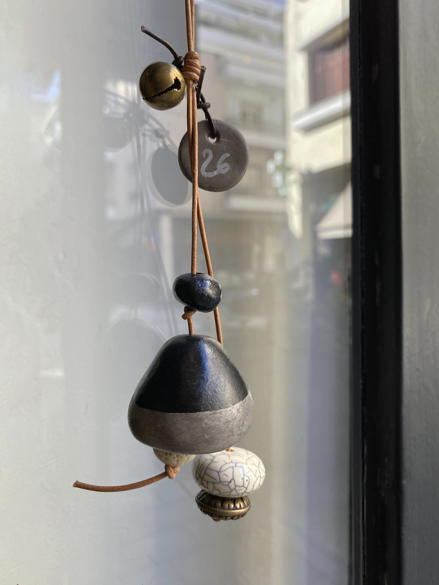 Χειροποίητη καμπανούλα από πηλό, ζωγραφισμένη στο χέρι. Δεμένη με δερμάτινο κορδόνι.