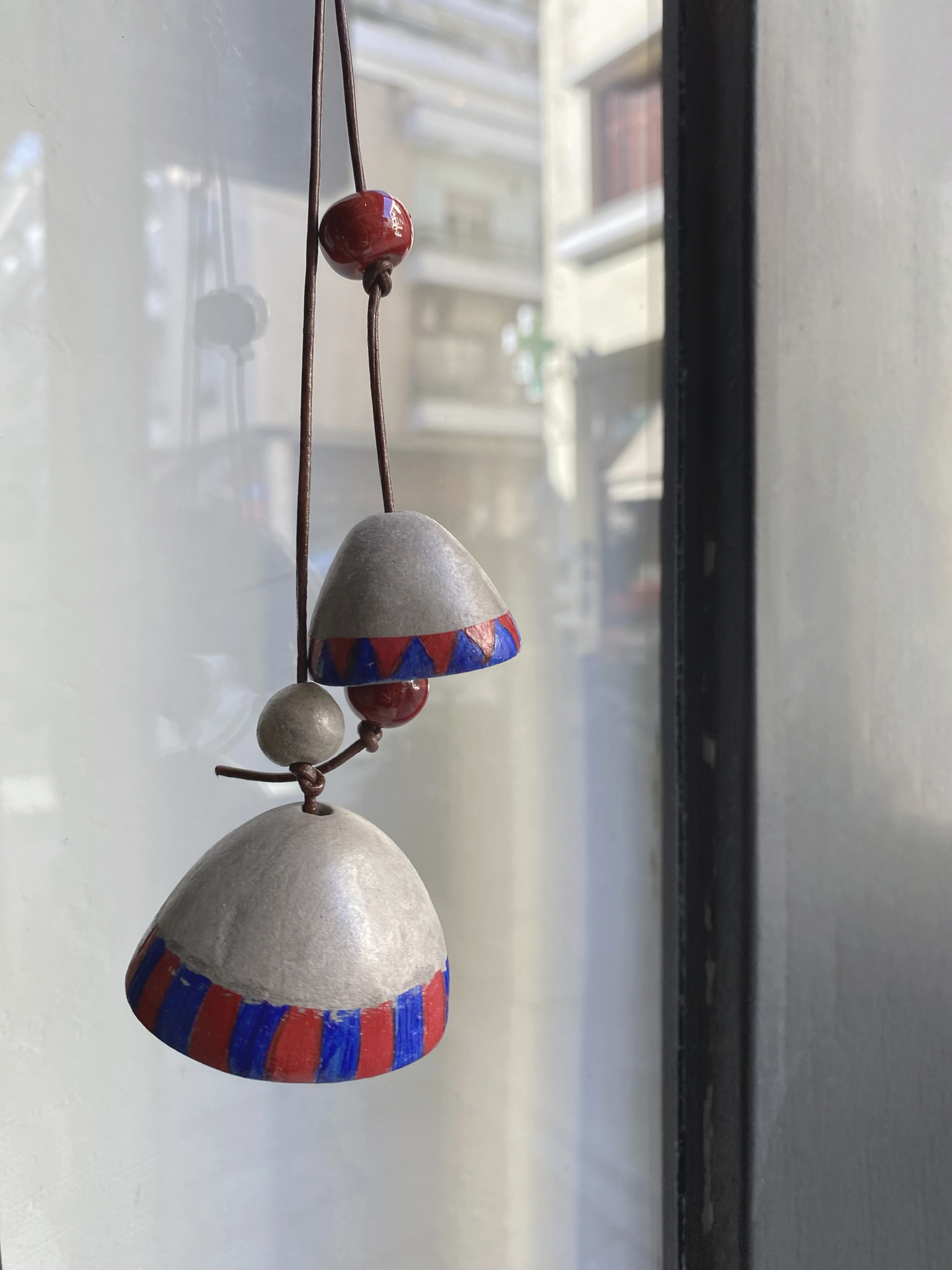 Χειροποίητες καμπανούλες από πηλό, ζωγραφισμένες στο χέρι. Δεμένες με δερμάτινο κορδόνι.