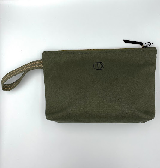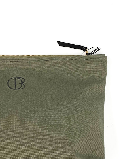 Υφασμάτινο τσαντάκι φάκελος με 100% βαμβακερό αδιάβροχο ύφασμα, ζωγραφισμένο λογότυπο στο χέρι. Διαθέτει φόδρα και λουράκι για τον καρπό. Κλείσιμο τσάντας με φερμουάρ.