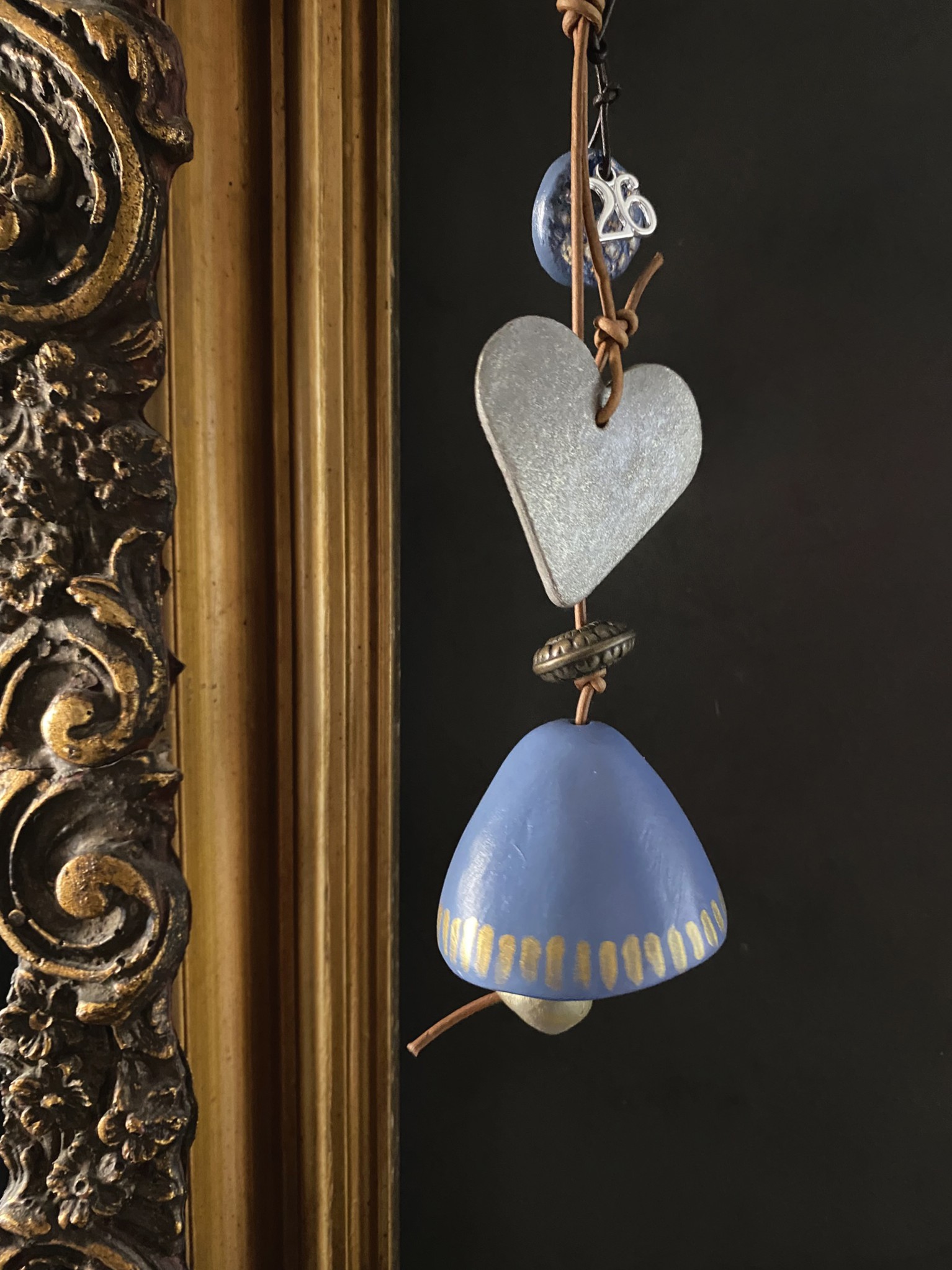 Χειροποίητη καμπανούλα από πηλό, ζωγραφισμένη στο χέρι. Δεμένη με δερμάτινο κορδόνι.
