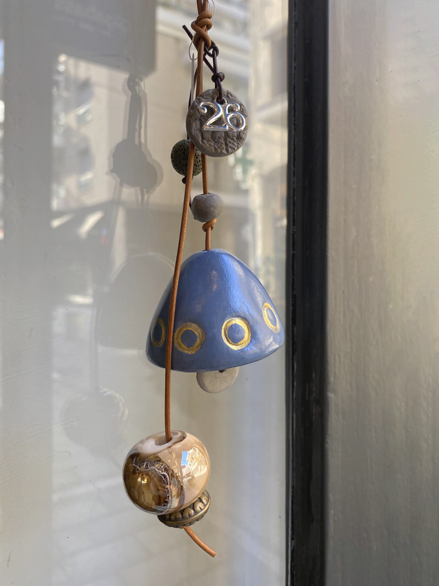 Χειροποίητη καμπανούλα από πηλό, ζωγραφισμένη στο χέρι. Δεμένη με δερμάτινο κορδόνι.