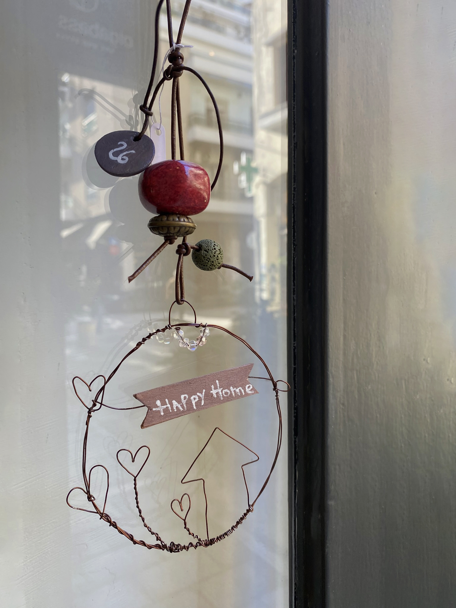 Χειροποίητο συρμάτινο γούρι. Δεμένο με δερμάτινο κορδόνι.
